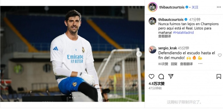 库尔图瓦写道:“我们从未在欧冠中走得这么远,但现在皇马就在这里。准备好迎接明天了!”